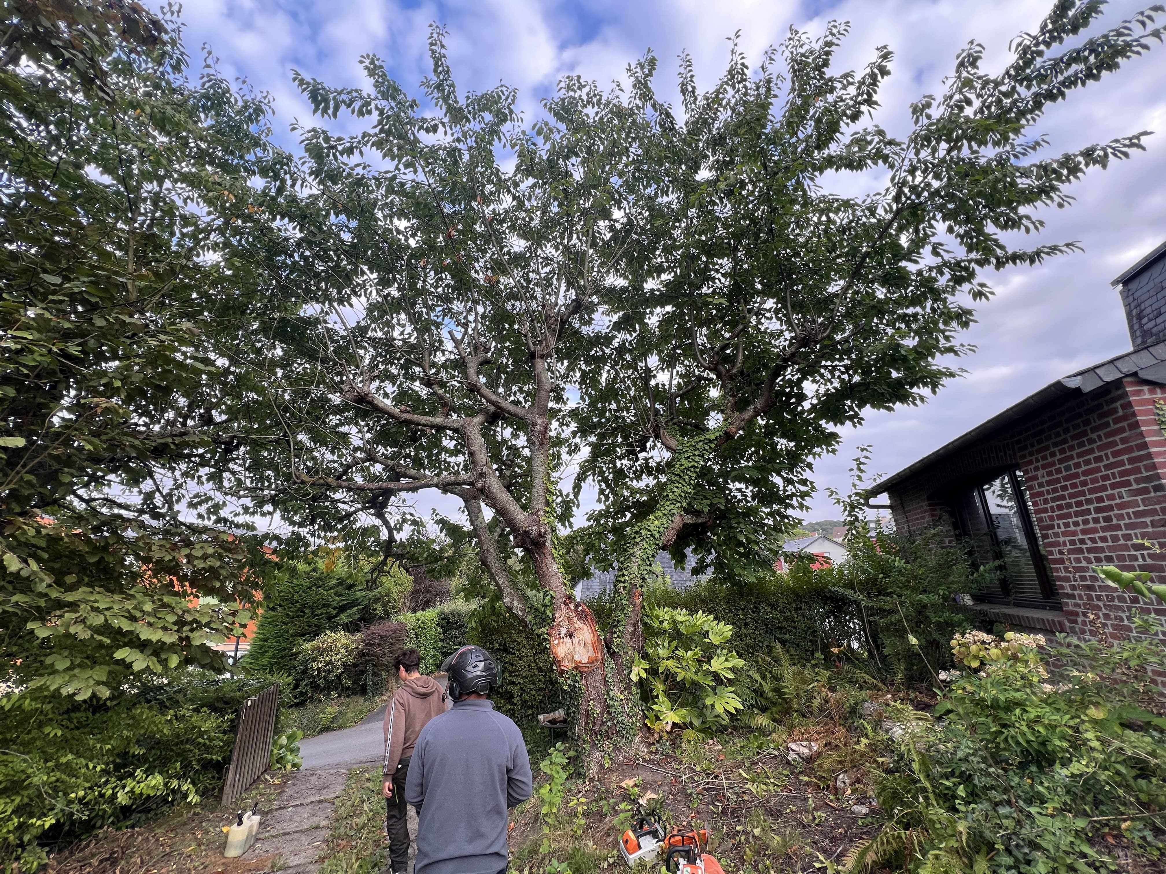 La première étape a consisté à analyser l’arbre et sécuriser la zone d’intervention. Nous avons ensuite procédé à une découpe progressive des branches principales à l’aide de tronçonneuses professionnelles, afin d’alléger la structure. Cette méthode permet de contrôler la chute et de limiter les dégâts éventuels sur l’environnement proche.