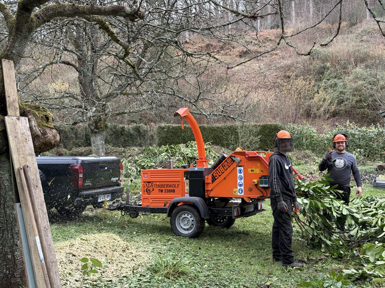Une fois la taille réalisée, les branches ont été broyées directement sur place à l’aide de notre broyeur professionnel. Cette étape permet de réduire le volume des déchets verts et de laisser un chantier propre et soigné. Les copeaux peuvent être valorisés en paillage, contribuant à une gestion plus écologique des résidus végétaux.